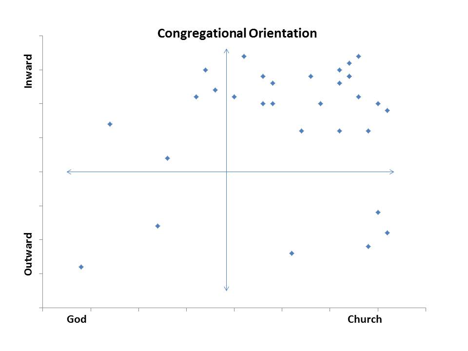 The survey involved selecting one preference from 60 forced choice pairs. For example, “If you could only do one of the following in each pair, which would you choose? — A fellowship supper or a Bible study. Attend worship or go on a mission trip. Sharing my faith with a non-Christian or visiting a church member. Working at a soup kitchen or my church rummage sale. Attend worship or a Bible study. Visit a sick church member or visit inmates in prison.” Then a weighted average of the overall scores were plotted on a chart indicating four orientations: inward focus on our church, inward focus on relationship with God, outward focus on our church, and outward focus on relationship with God.
