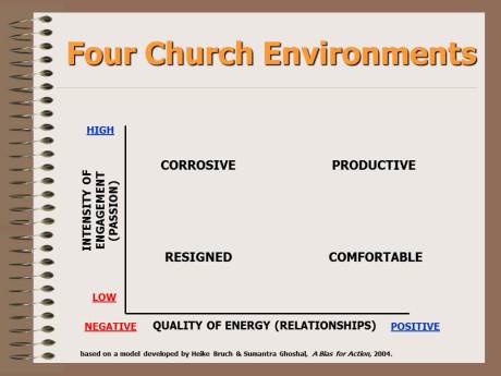 Where the passion is low and the relationships are poor, people are relatively disengaged and the environment is resigned.  It is very easy for people to “check-out,” to simply walk away and go to another church or just stay home.  People drift to inactivity when the commitment and connection is low.  Most of our inactive members or members who leave during a time of conflict comprise the resigned environment within the congregation.