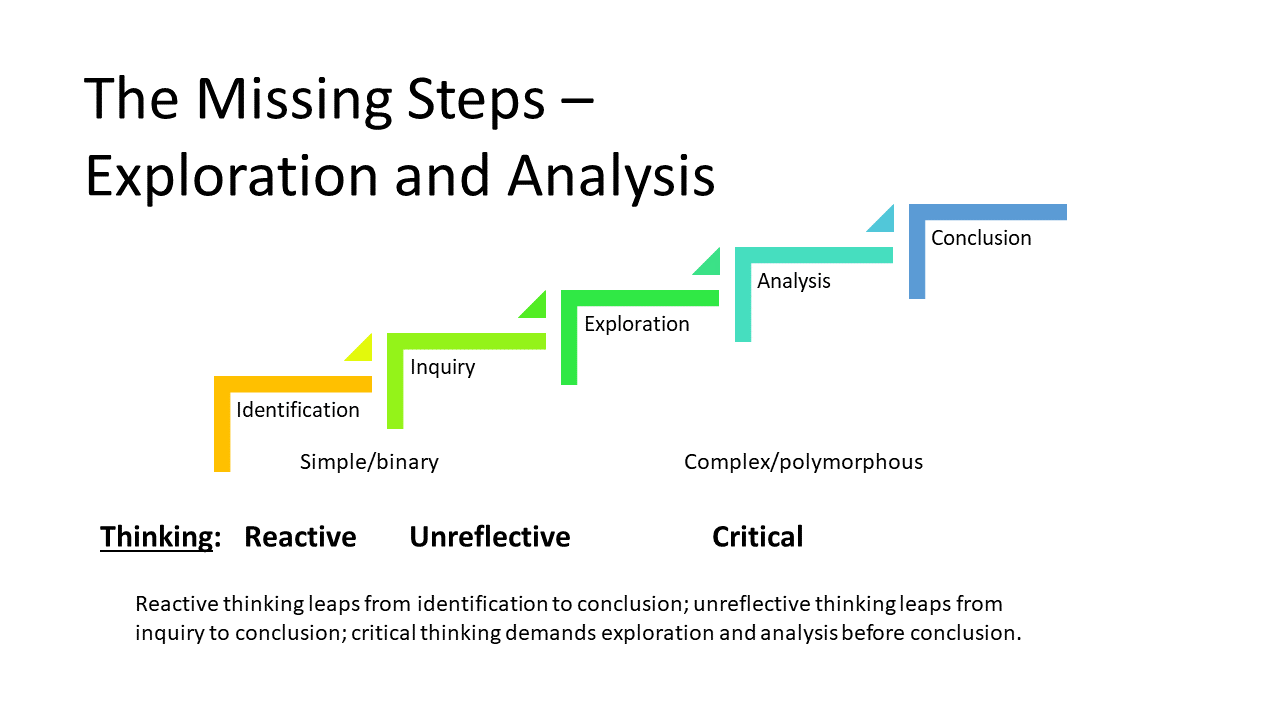 An example. Let’s say there is, oh, I don’t know, a global pandemic. You have identified that the pandemic is happening. You turn to a trusted source to find out more. Facebook, Fox, CNN, NPR offer reports – what it is, how serious, how to respond, what “experts” are saying. This reporting contains a large measure of personal opinion and party-line reasoning. It would be very simple (reactive) to simply agree with what you first hear, or to listen to similar voices from similar sources as a way of expanding your own opinion and perspective on what to believe and what to reject. This grounds opinion and understanding in unreflective/reinforcing thinking. Your opinion is shaped along a fairly narrow track, but it is clear and makes sense as far as it goes. Your understanding is framed in binary terms – the pandemic is serious or not, masking is a good idea or not, vaccines are necessary or not; “our” people say this, “those” people say that. Our people are right; their people are wrong. Those people might even be doing this to us! Opinions polarize around “us/them” oppositions.