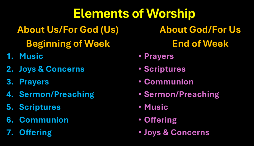 I asked people to place in order of importance: prayer, hymns/music, reading of scripture, preaching, communion, joys and concerns, and the offering. Just note the differences in the two columns: